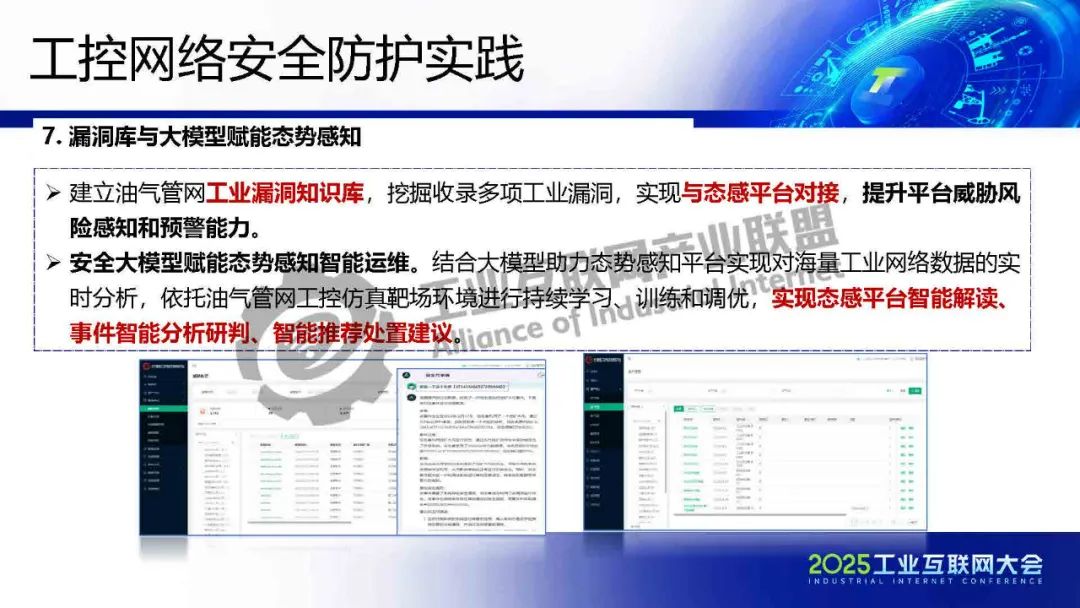 賈立東介紹,目前,國家管網(wǎng)所轄油氣管道近11萬公里,已形成“三縱四橫、連通海外、覆蓋全國”的大型“廣域分布”油氣輸送網(wǎng)絡(luò),管道輸送的成品油、原油、天然氣在全國年消費(fèi)量占比達(dá)到 28%、35%和 60%,成為國民經(jīng)濟(jì)的“能源生命線”。工控網(wǎng)絡(luò)安全防護(hù)結(jié)合大模型助力態(tài)勢感知平臺實(shí)現(xiàn)對海量工業(yè)網(wǎng)絡(luò)數(shù)據(jù)的實(shí)時分析,依托油氣管網(wǎng)工控仿真靶場環(huán)境進(jìn)行持續(xù)學(xué)習(xí)、訓(xùn)練和調(diào)優(yōu),實(shí)現(xiàn)態(tài)感平臺智能解讀、事件智能分析研判、智能推薦處置建議。
