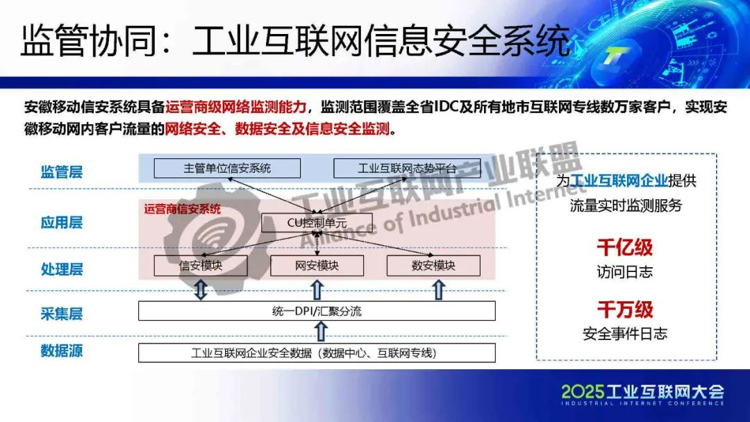 5月23日,在2025工業互聯網大會“新型工業化網絡與數據安全專題活動”上,中國移動通信集團安徽有限公司網管中心網絡安全室經理王君誠發表了《基于基礎電信網絡的安全監測服務賦能實踐》的主題演講。