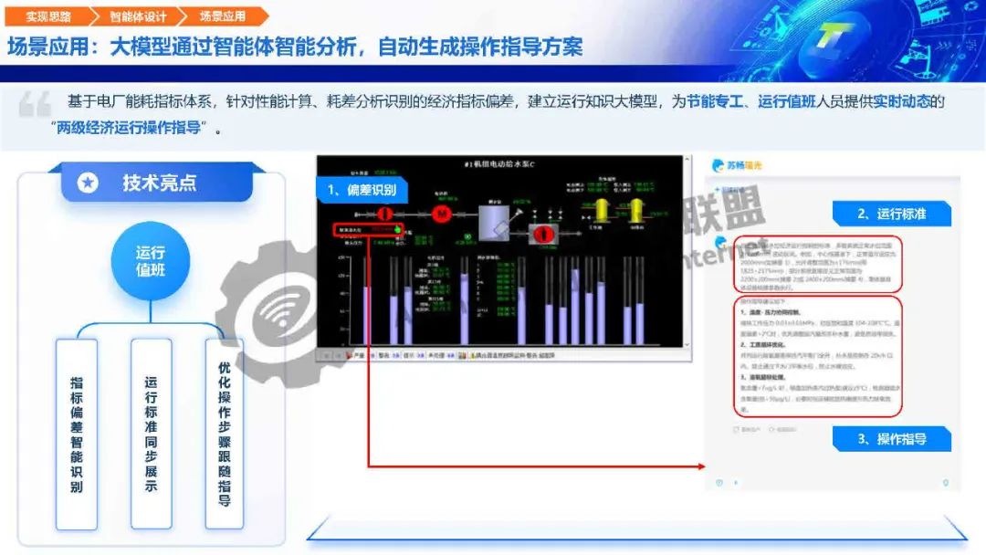針對運行調優煤耗影響因子復雜、偏差分析難度大、運行操作要求高等痛點,瑤光工業大模型構建機組運行尋優智能體、運行問答智能體、運行培訓智能體,重點打造機組性能智能評價、尋優推理、報告自動生成核心能力,用知識經驗模型優化機組“性能評價、節能診斷、生產調度、運行操作”關鍵生產流程,全面保障各機組運行可靠性,提升經濟運行水平。