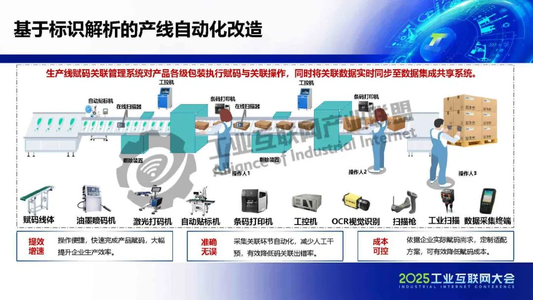 基于標識解析的產線自動化改造方案核心是通過生產線賦碼關聯管理系統實現產品各級包裝的賦碼與數據關聯,并實時同步至數據集成共享系統。系統提供多項服務,包括自動貼標機、數碼打印機、攝像頭、掃描槍等設備,支持線上拍照、刷臉驗證、數據采集等功能。賦碼線體集成了油墨噴碼機、激光打印機、OCR視覺識別等技術,確保賦碼高效精準。