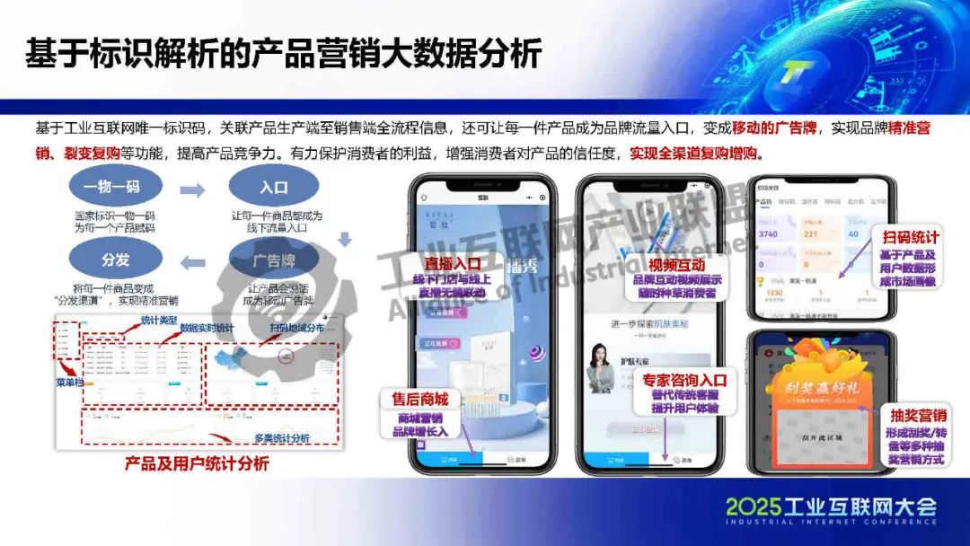 霍健介紹,工業互聯網唯一標識碼可以關聯產品生產端至銷售端全流程信息,還可讓每一件產品成為品牌流量入口,變成移動的廣告牌,實現品牌精準營銷、裂變復購等功能,提高產品競爭力,有力保護消費者的利益,增強消費者對產品的信任度,實現全渠道復購增購。將基于標識解析的SCRM管理系統應用于產品中,可以提高消費端用戶體驗,幫助品牌進行客戶管理,及時掌握消費數據,助力品牌精準決策,實現大數據品牌數字化營銷。