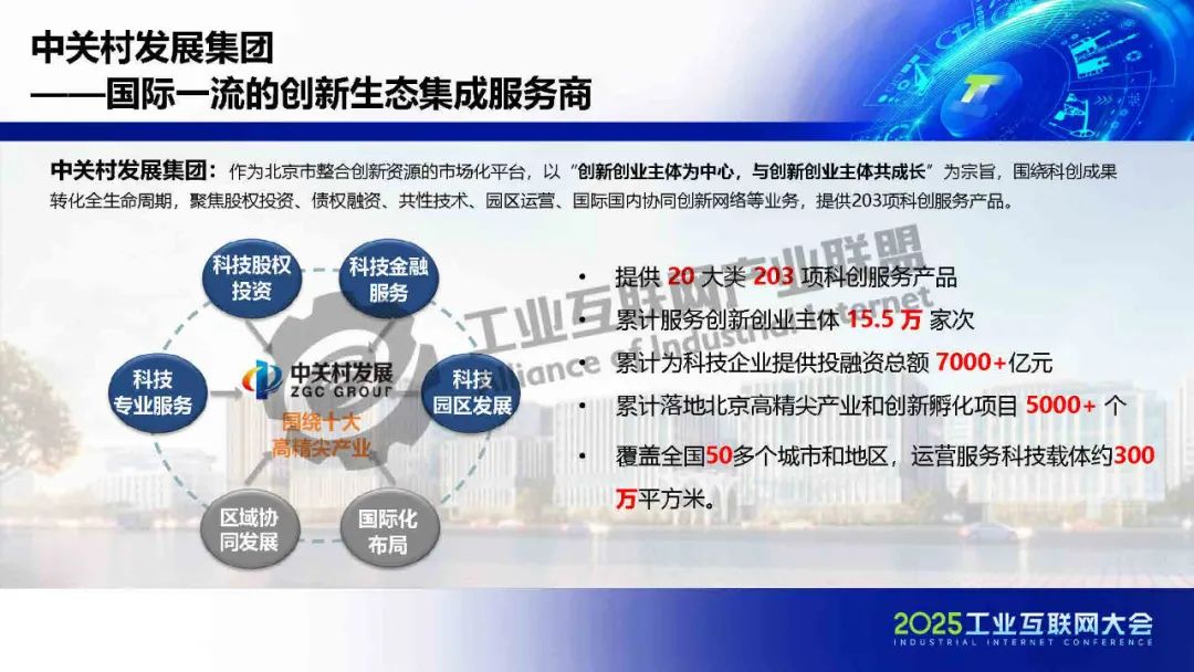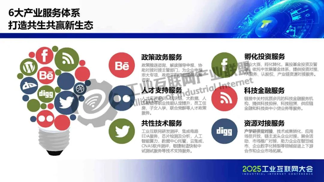 中關村工業互聯網產業園提供六大產業服務體系,打造共生共贏生態。一是政策政務服務,協助企業申報專項及對接主管部門。二是人才支持服務,涵蓋實習實訓、技能認證及子女入學等。三是共性技術服務,包括工業互聯網研發測評、芯片檢測、AI能力等技術支持。四是孵化投資服務,通過創業大賽、基金投資等助力企業成長。五是科技金融服務,鏈接擔保、租賃等資源支持中小企業。六是資源對接服務,促進產學研合作、技術轉化及市場拓展。全方位服務推動企業創新與發展。