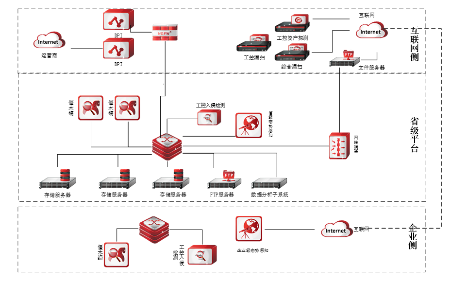 本項目主要是在互聯網側、省級平臺和企業側實施的部署:在互聯網區(運營商)部署漏掃產品,通過網絡隔離設備導入內網FTP服務器,再接入省級平臺,向省級平臺傳輸監測數據,部署DPI流量分析設備,為工控入侵檢測提供原始工控流量,為僵木蠕提供全網抽樣流量省級的態勢感知平臺部署在核心區,通過對接收的企業側和互聯網側的檢測數據進行綜合分析,實現省級工業互聯網安全全面及實時的監測;在省企業區域部署企業級的態勢分析系統及僵木蠕、工控審計等探針,向省級態勢感知平臺提供監測數據。