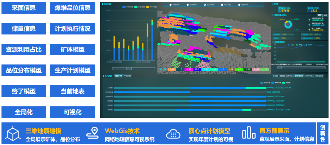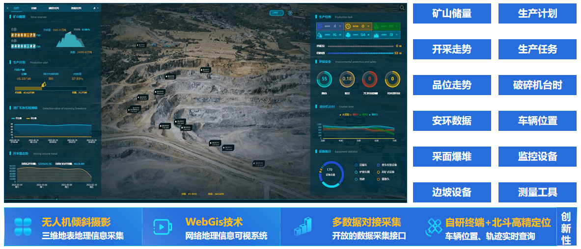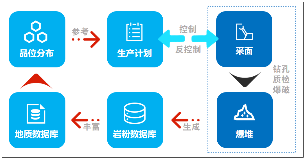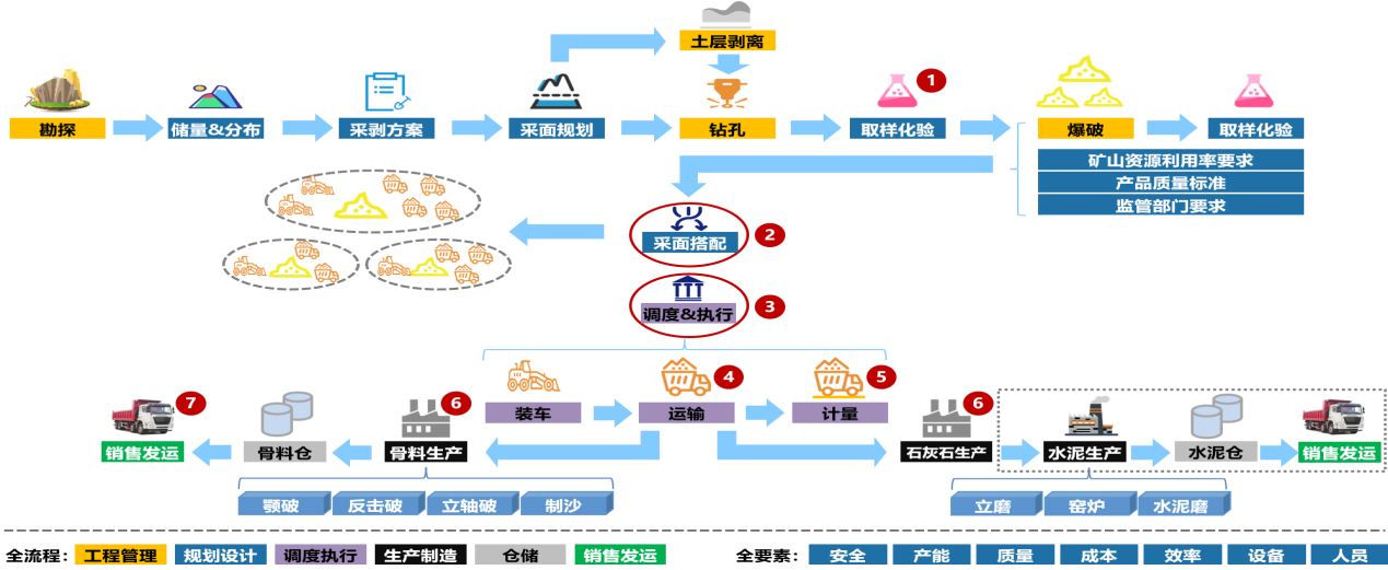 根據露天非金屬礦山企業的實際生產需求,結合行業痛點,通過對礦山穿、爆、裝、運、卸等各個生產環節長期跟蹤調研,全流程收集分析生產數據,采用信息化、數字化、智能化手段,對礦山資源開采、生產計劃、爆破流程、車鏟調度、品位搭配、裝卸計量、安全管理等各個生產環節進行流程優化與管控,解決傳統礦山數字化程度低、生產數據遺失、業務環節分散不互通的難題,實現礦山資源開采的數字化、安全生產的智能化以及智能管控的集成化。