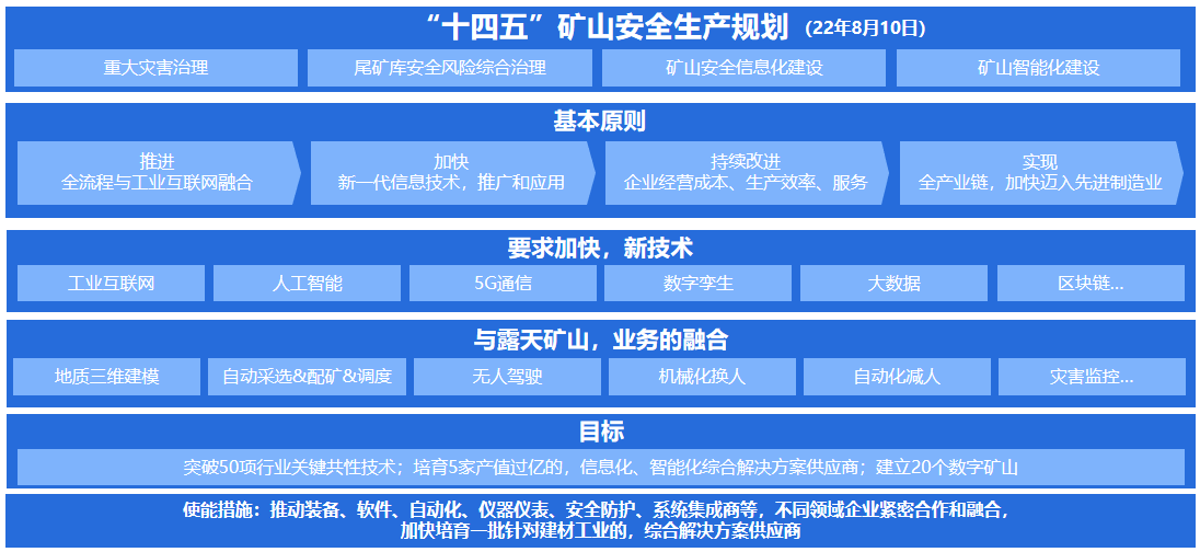 自2015年以來,國家及地方出臺多部智能礦山建設政策、指導意見及行業規范,其中包含《中國制造2025》、《砂石行業綠色礦山建設規范》(DZ/T 0316-2018)、《水泥灰巖綠色礦山建設規范》(DZ/T 0318-2018) 、《河南省非煤礦山智能化建設實施方案(試行)》等,支持并積極引導煤礦及非煤礦山向智能化發展,同時,在科技、產業和金融等方面給與全方位支持。作為實現“雙碳”目標,助力礦山低碳、綠色發展的重要手段,政策明確推進礦業領域科技創新,加快建設數字化、智能化、信息化、自動化礦山,推進節能減排,將智慧礦山建設提升到新的高度。