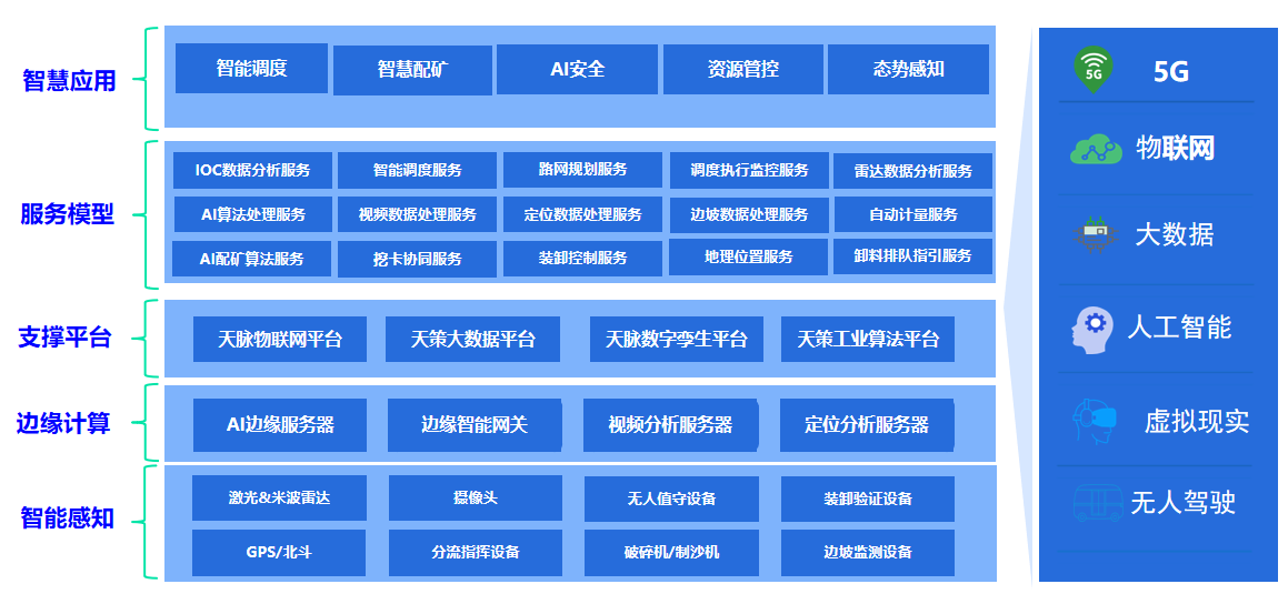 我們融合5G、物聯網、大數據、人工智能、無人駕駛等前端主流技術,通過天信工業互聯網平臺的物聯網平臺、大數據平臺、數字孿生平臺、工業算法平臺提供一系列服務模型,為智慧礦山頂層應用提供服務支撐。