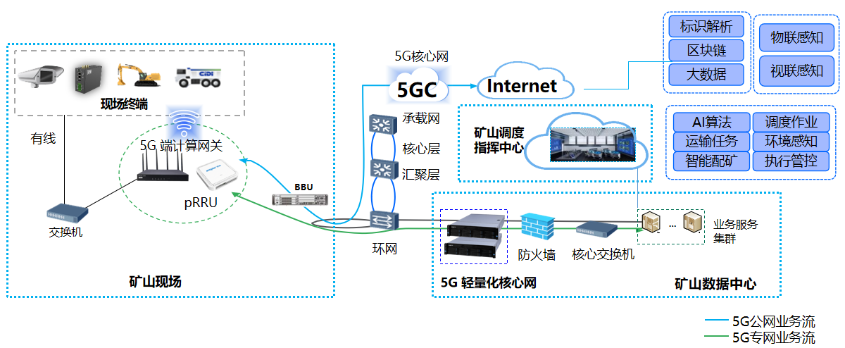 礦山開采現場采用5G網絡鏈接遠程挖機、無人駕駛車輛、工業采集網關等設備,通過工業環網數據傳輸至礦山數據中心為礦山調度智慧中心提供數據支持,同時通過互聯網鏈接云端標識解析、區塊鏈、大數據、AI工場等云端支持平臺。