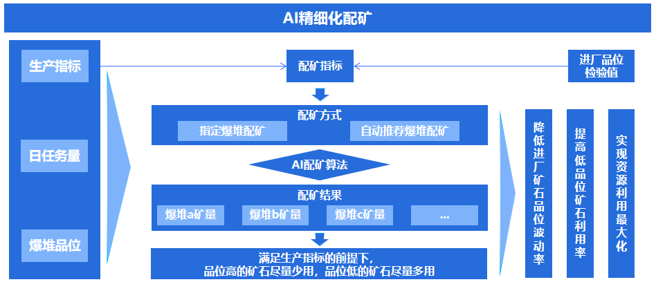 智能配礦:自研AI配礦算法,滿足配礦指標前提下,盡可能提高低品位礦石利用率,實現資源利用的最大化。