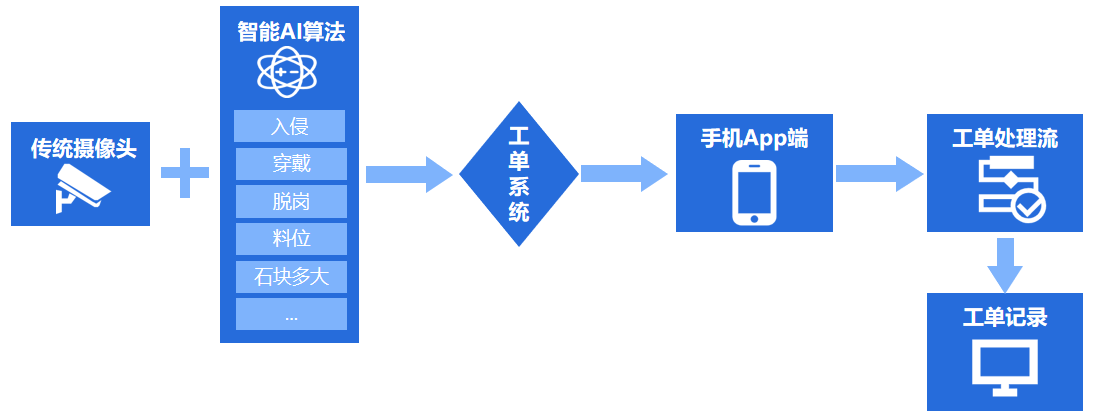 在原有監控設備上部署 AI 識別算法,對高風險安全區域、重點生產區域進行情景識別,可實現對入侵、穿戴、脫崗、煙塵、料位、石塊過大等事件的精準識別,并與工單聯動,出現異常立即向相關人員手機端 App 推送工單,縮短響應時間,實現安全管理的智能化。