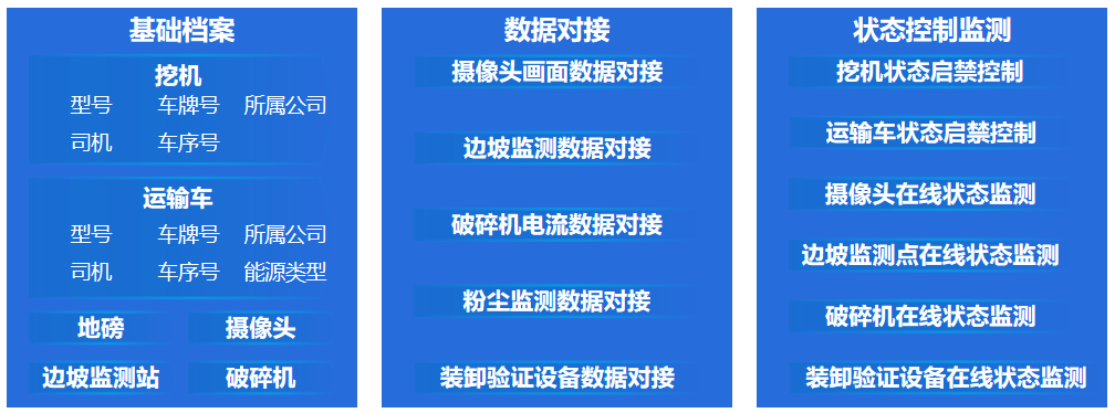 作為礦山生產及輔助生產設備的基礎檔案,如運輸車、挖機、破碎機、攝像頭、邊坡檢測點、裝卸驗證設備等,通過接口對接可實時展示設備的運行狀態,并與工單聯動,出現異常立即向相關人員手機端 App 推送工單。
