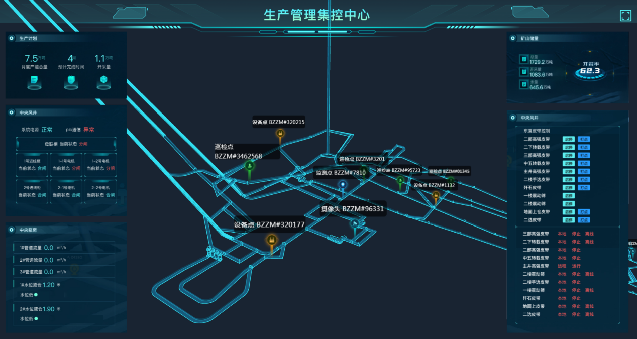 首頁 WebGis 地圖不只是三維設計初級階段的可視化模型,而是載有各類信息的數字綜合體,包括實時生產信息、車輛運行軌跡、采面信息、視頻監控、邊坡預警信息等,實現了生產過程高度集成化的一張圖管理。