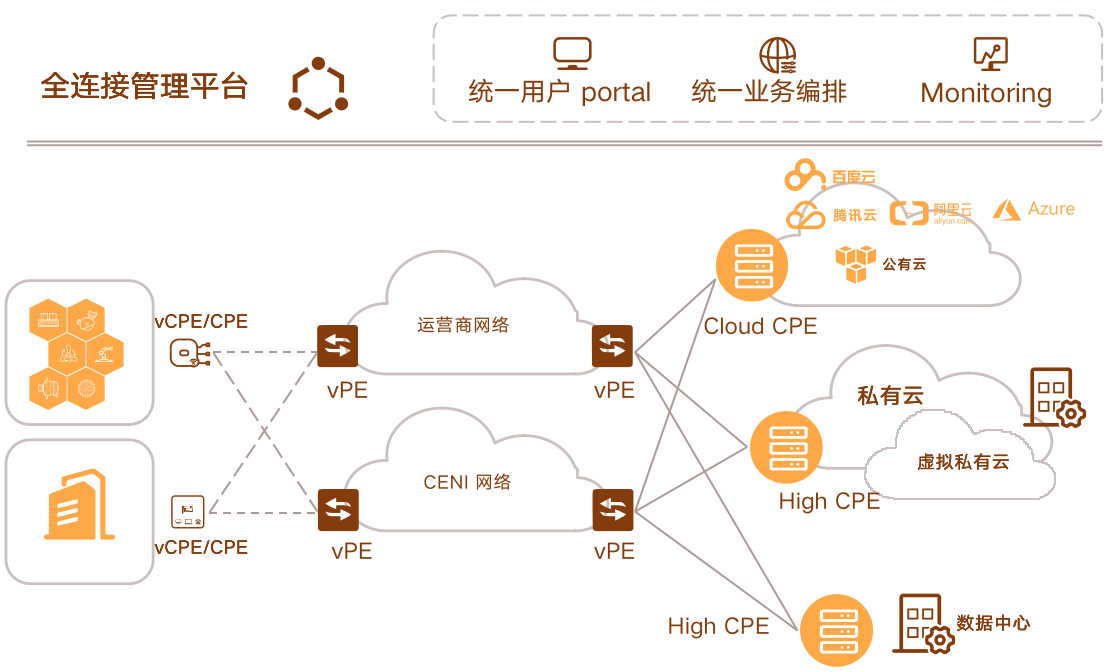 包括CPE、VPE、端局云、邊緣計算節點、光傳輸鏈路和數據中心。實現網絡、計算和存儲資源的監測、配置。