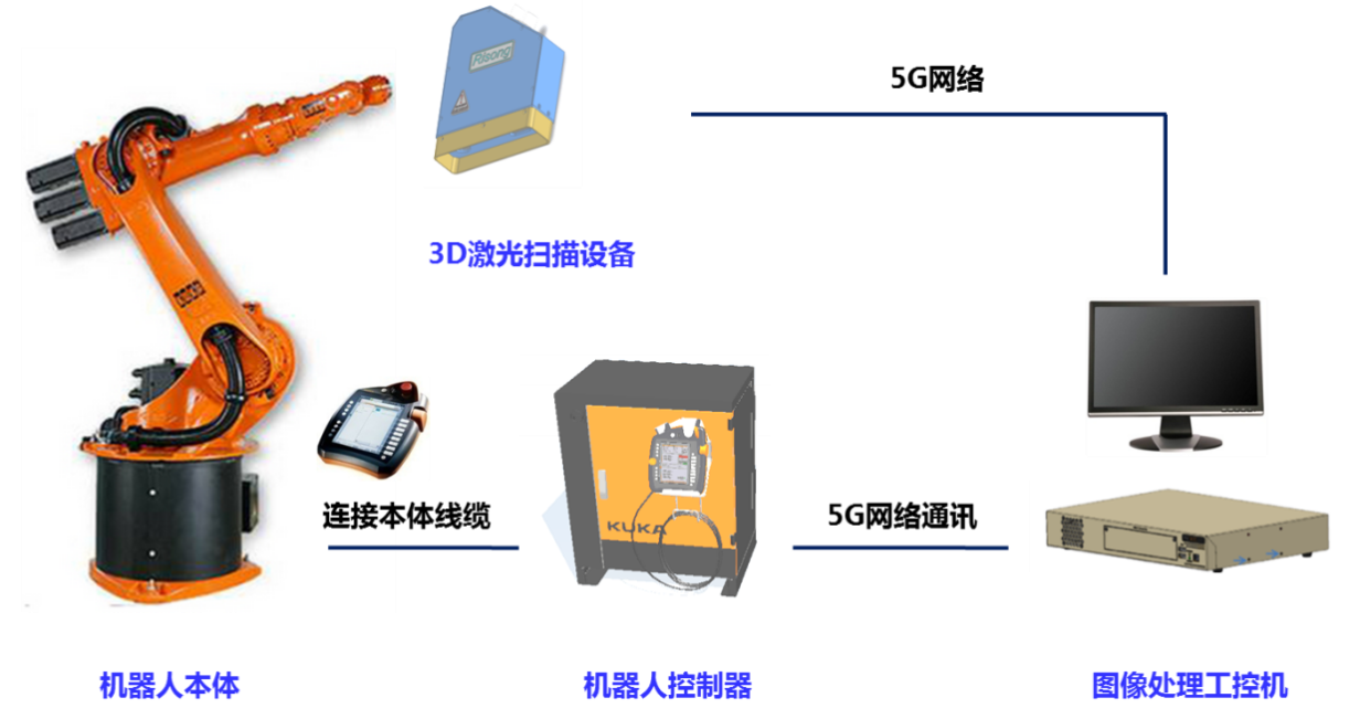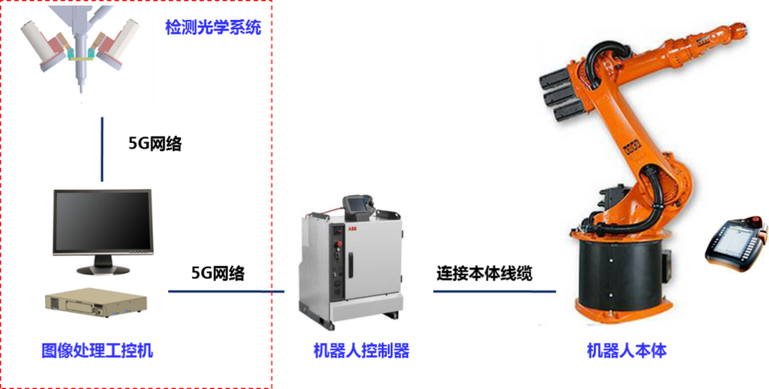 在涂膠機(jī)器人手臂加裝3D激光掃描設(shè)備,智能相機(jī)和補(bǔ)光設(shè)備,因機(jī)器手臂需進(jìn)行靈活作業(yè),所以數(shù)據(jù)通訊不能采用傳統(tǒng)的網(wǎng)線接入的方式,同時(shí)因3D掃描數(shù)據(jù)是動(dòng)態(tài)數(shù)據(jù)傳輸,需實(shí)時(shí)傳輸且數(shù)據(jù)量較大,需借助5G網(wǎng)絡(luò)實(shí)現(xiàn)大數(shù)據(jù)同步傳輸,便于圖像處理系統(tǒng)能依據(jù)數(shù)據(jù)實(shí)時(shí)成像,其架設(shè)示例如下:紅框標(biāo)注部分為3D激光掃描設(shè)備和智能相機(jī)。