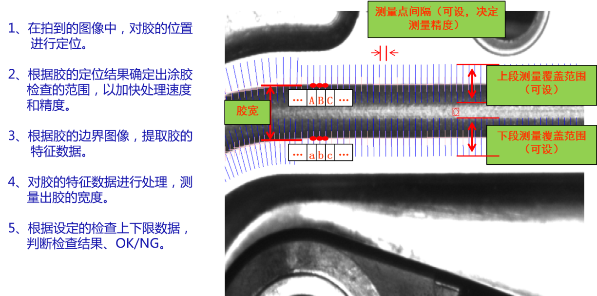 處理后圖片,系統(tǒng)會(huì)對(duì)圖片中膠線進(jìn)行定位分析,識(shí)別膠線位置,測(cè)定膠線的各項(xiàng)參數(shù),并與工藝指標(biāo)要求進(jìn)行判定,最終給此次涂膠作業(yè)的檢測(cè)結(jié)果給予判定,其檢測(cè)過(guò)程如下圖示例所示: