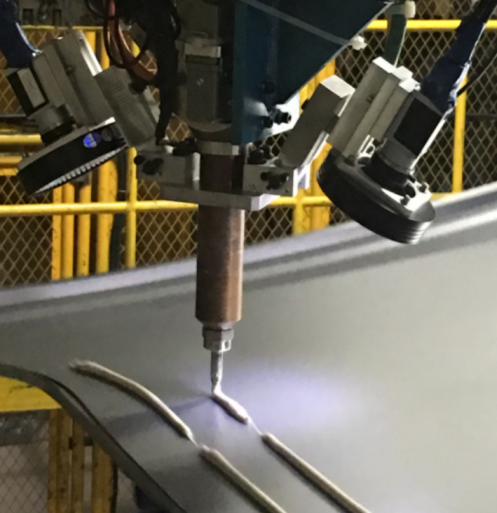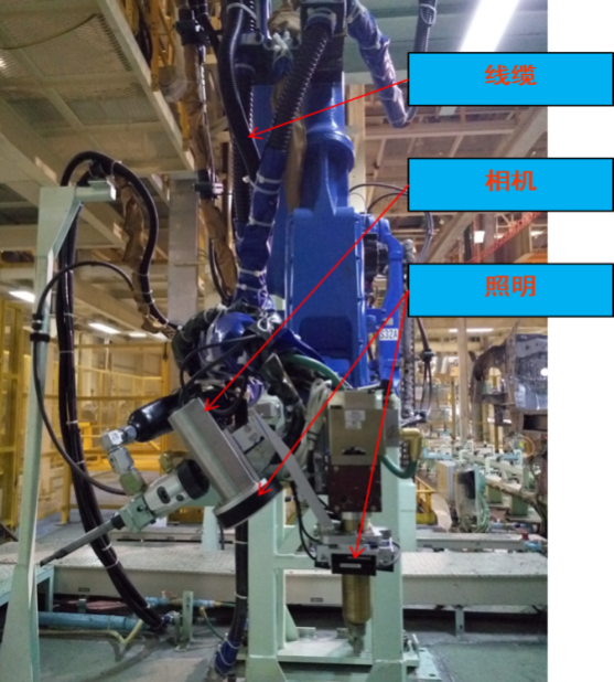 在涂膠機(jī)器人手臂加裝雙攝像頭,并配置補(bǔ)光設(shè)備,于膠槍兩側(cè)跟隨膠槍移動(dòng)拍攝,將海量圖片通過(guò)5G網(wǎng)絡(luò)傳遞給圖像處理系統(tǒng),下圖是設(shè)備安裝的示意圖: